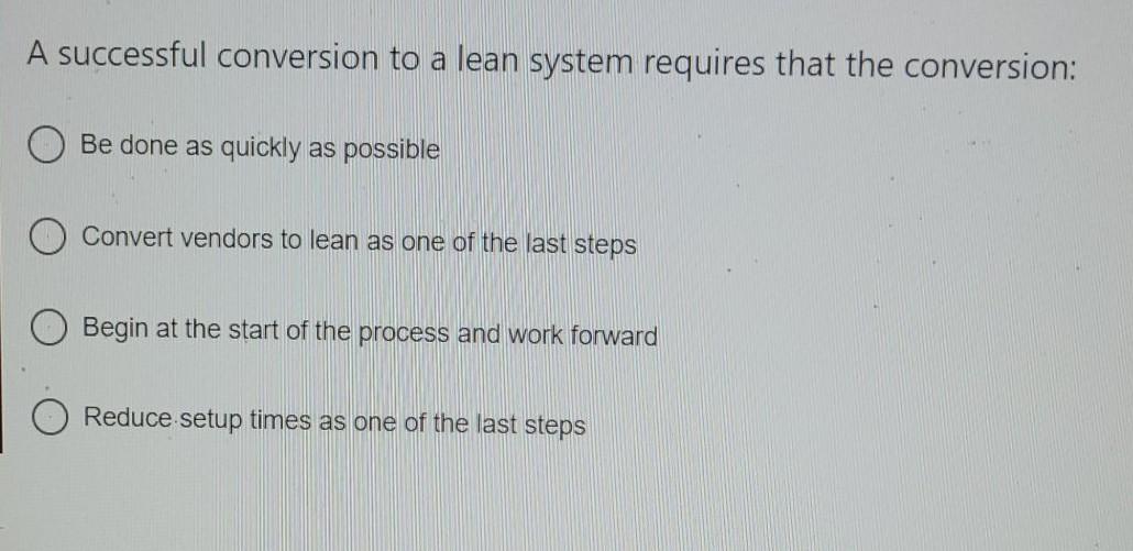 Be done as quickly as possible B. Be done as quickly as possible B. All of the choices. A potential obstacle to conversion to a lean system is. A successful conversion to a lean system requires that the conversion. System Conversion Approach 1. Asked Sep 7 2019 in Business by KirraBB. Be done as quickly as possible. All of the above.